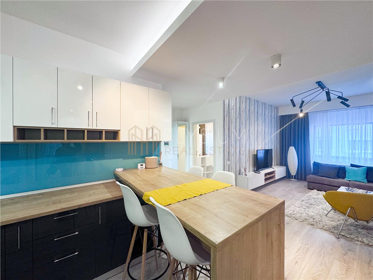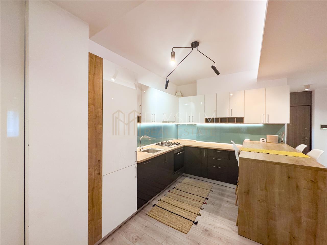 - Bucataria este deschisa, dispune de o suprafata generoasa si este mobilata complet cu foarte multe spatii de depozitare si electrocasnice noi, de ultima generatie. Aceasta integreaza si zona pentru servit masa ce cuprinde un blat de lemn accesorizat cu scaune inalte de bar si care este potrivita pentru 4 persoane.