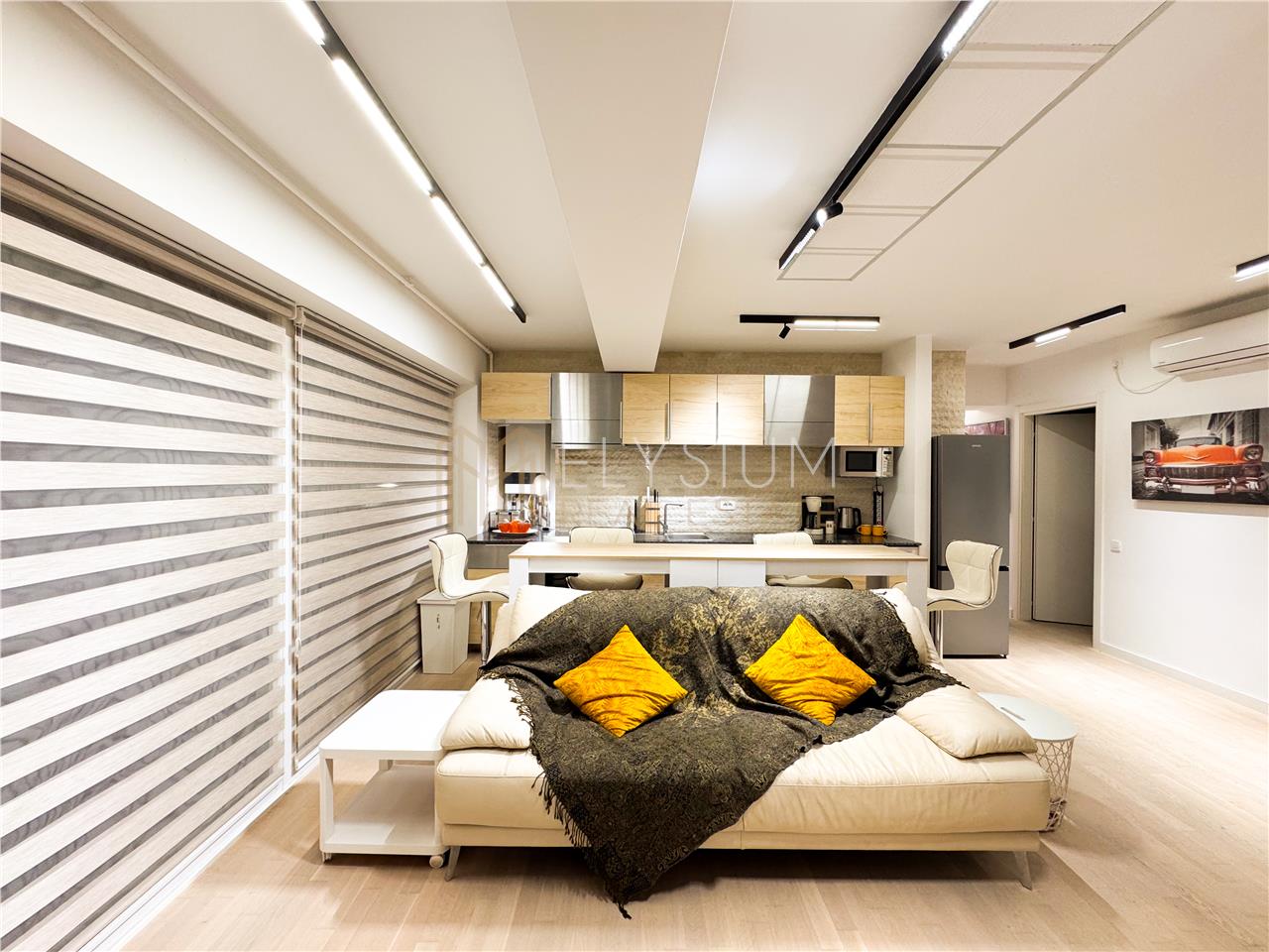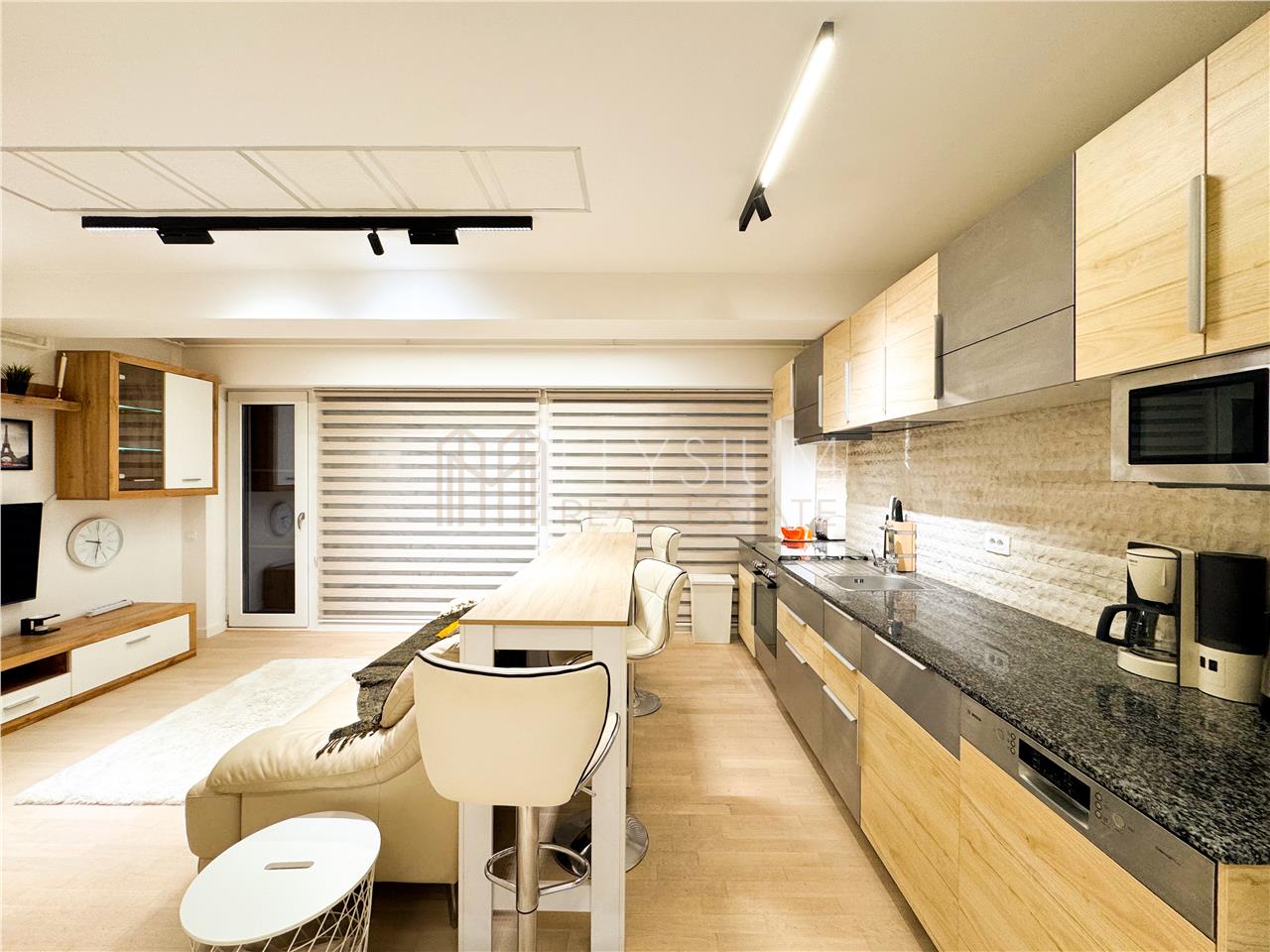 - Livingul este amenajat cu o canapea confortabila, comoda, televizor tip Smart TV, multiple spatii de depozitare si este decorat cu multiple elemente de decor ce ofera o atmosfera primitoare si calduroasa incaperii.