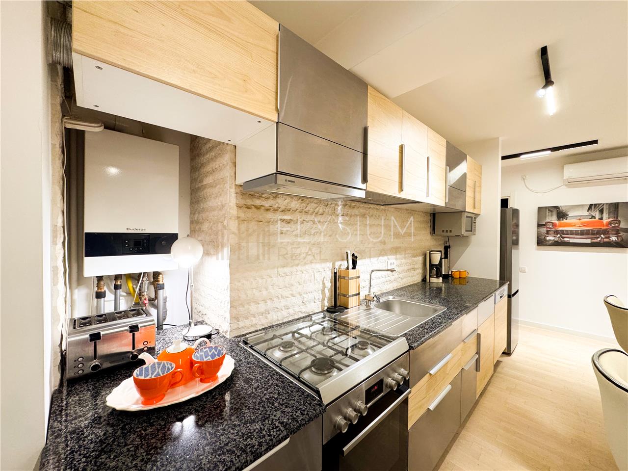 - Bucataria este complet mobilata si utilata cu multiple spatii de depozitare si electrocasnice moderne mari dar si mici, precum espressor de cafea, prajitor de paine, toaster.