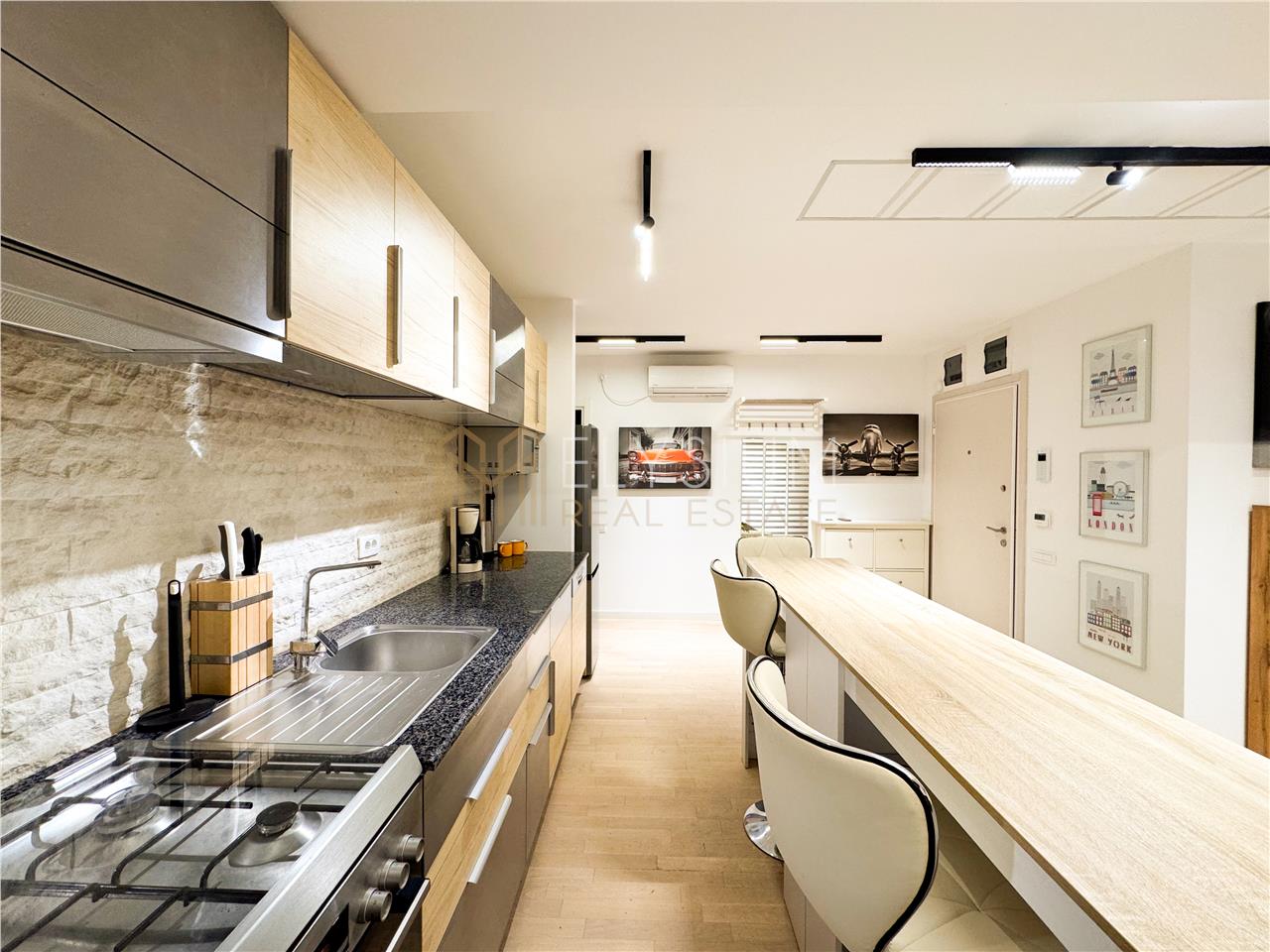 - Zona de dining ce conecteaza zona de relaxare si bucataria cuprinde o masa inalta de lemn, este accesorizata cu scaune de bar din piele si este potrivita pentru 4 persoane.