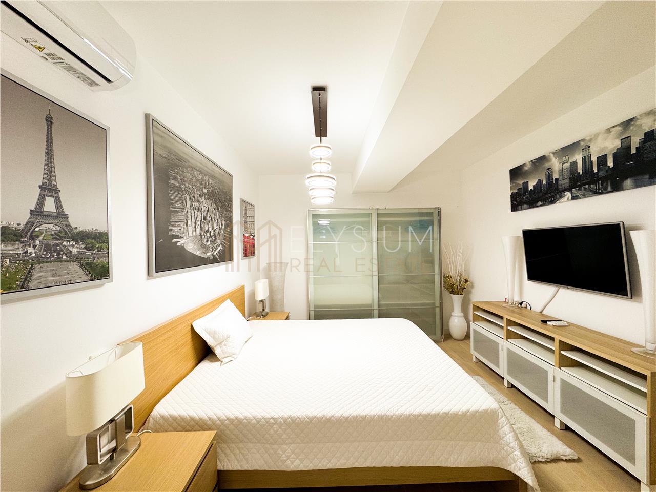 Zona de noapte a apartamentului este reprezentata de un dormitor cu o suprafata mare, mobilat cu un pat tip king-size, noptiere, un dulap de dimensiuni mari, comoda si televizor Smart TV si integreaza o camera de dressing dar si un spatiu de lucru, amenajat cu birou si scaun.