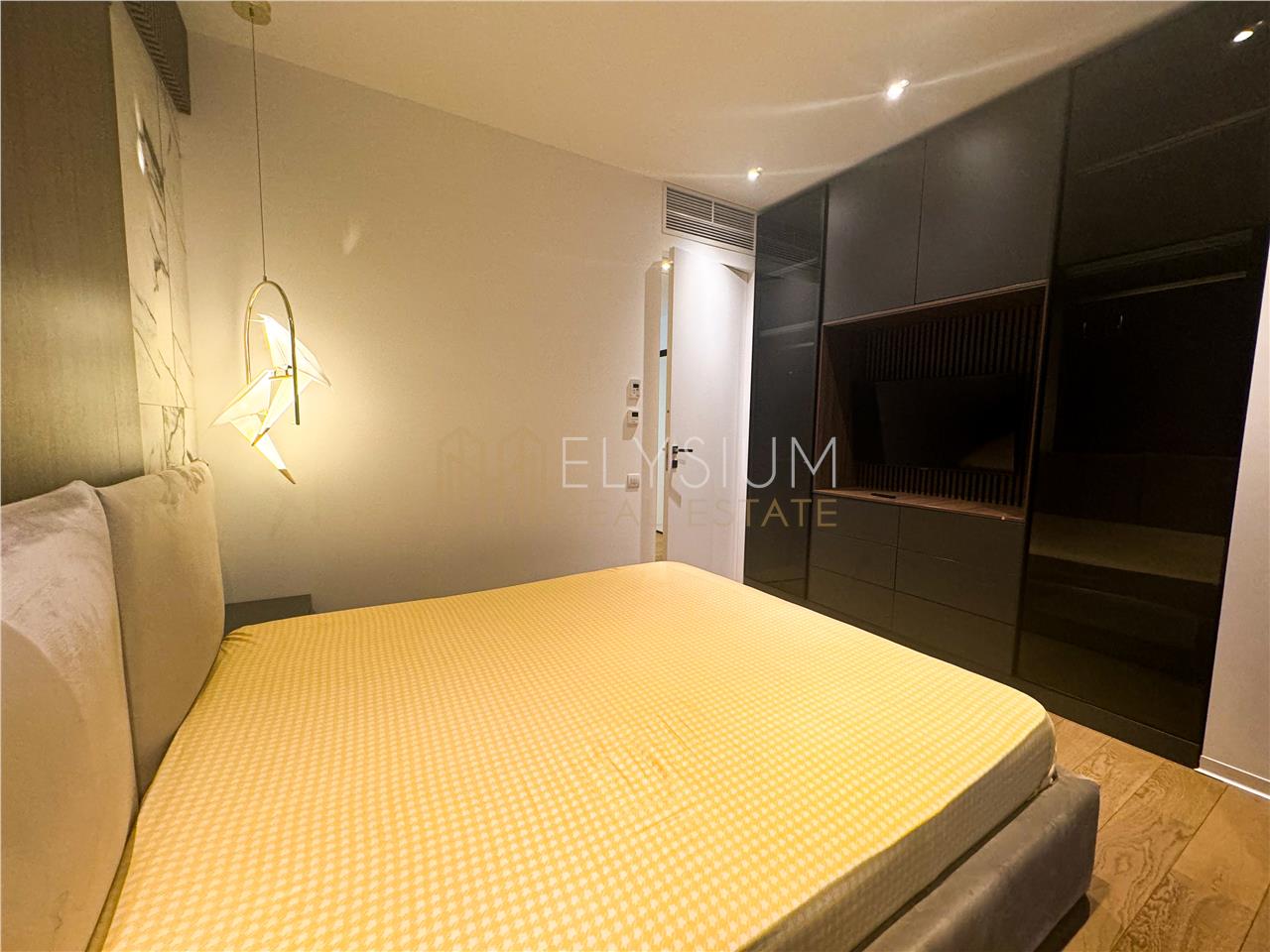 - Dormitorul matrimonial este amenajat cu un pat dublu generos si un decor modern ce imbina perfect confortul cu stilul contemporan. Peretele de accent adauga un aer exclusivist, iar culorile neutre si materialele de calitate superioara creeaza o atmosfera calma și sofisticata. Sistemul de iluminare subtil si perdelele de tip blackout ofera confort maxim, asigurand nopti odihnitoare intr-un spatiu intim. Dormitorul dispune si de un dressing incorporat, oferind un spatiu amplu de depozitare, complet integrat in designul modern al camerei.