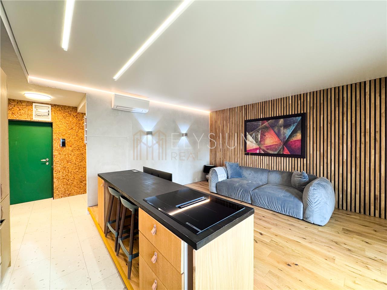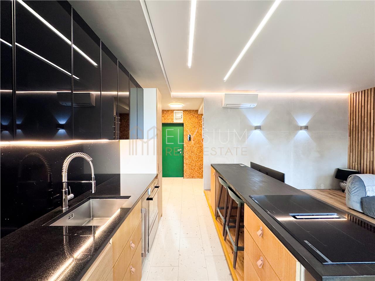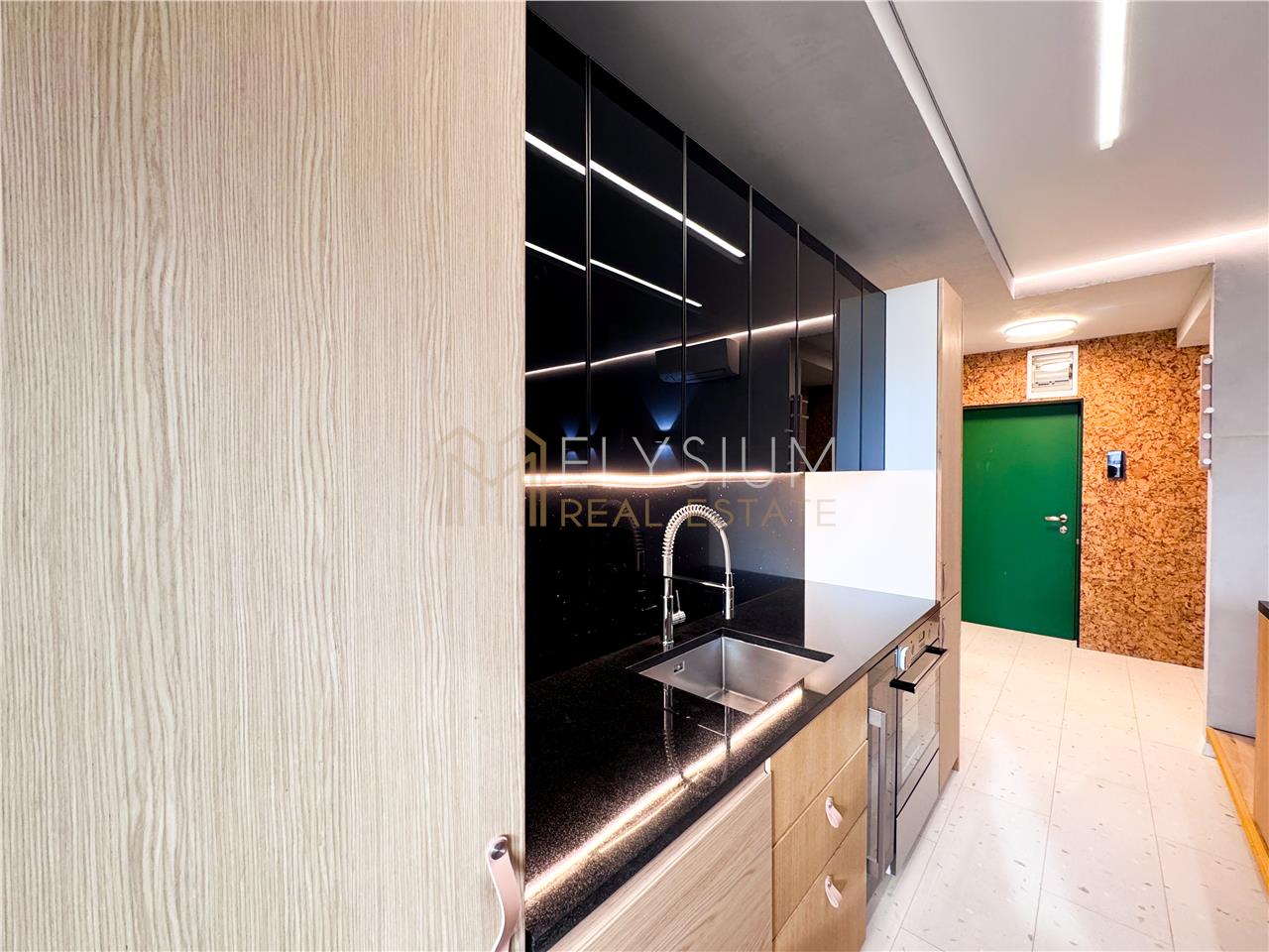 - Bucataria este deschisa, complet mobilata cu spatii de depozitare si dotata cu electrocasnice noi si moderne. Aceasta dispune de o mica insula de bucatarie ce este accesorizata cu 2 scaune inalte, ce deserveste si ca spatiu pentru servit masa.