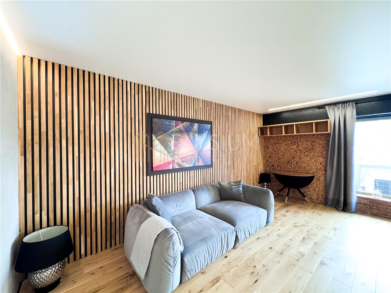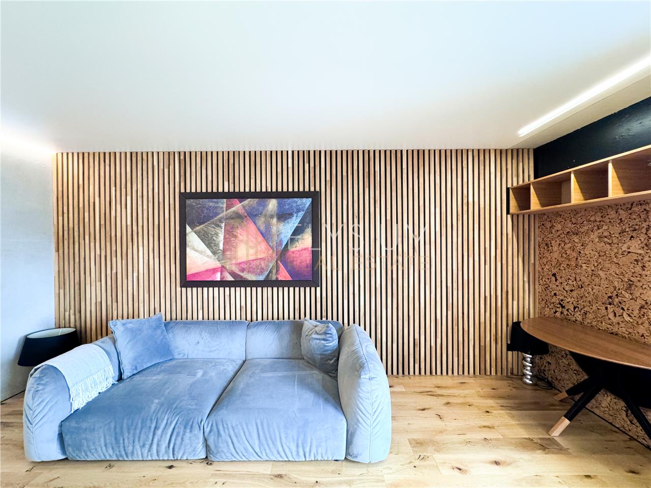 - Livingul este predominat de o atmosfera primitoare si foarte confortabila, amenajat in culori neutre completate de texturile din lemn. Acesta este amenajat cu o canapea confortabila, comoda ce acomodeaza si televizorul tip Smart TV si spatii de depozitare. Adiacent, se regaseste si o zona de dining ce poate deservi si ca spatiu de birou.