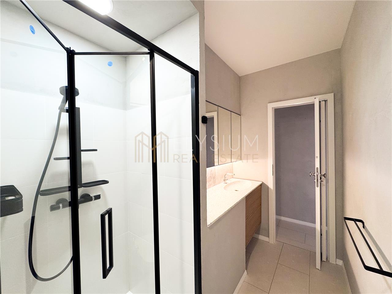 - Baia principala a apartamentului deserveste zona de noapte si este dotata cu lavoar, vas de toaleta, cabina de dus si spatii de depozitare.