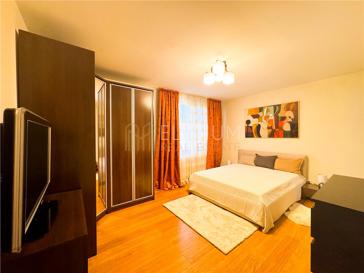 - Dormitorul matrimonial dispune de un pat de dimensiuni mari, noptiere, comoda ce acomodeaza televizorul tip Smart TV, dulap generos pentru depozitarea hainelor si un spatiu suplimentar de depozitare. Acesta dispune si de o baie proprie, dotata cu lavoar, vas de toaleta si cabina de dus.