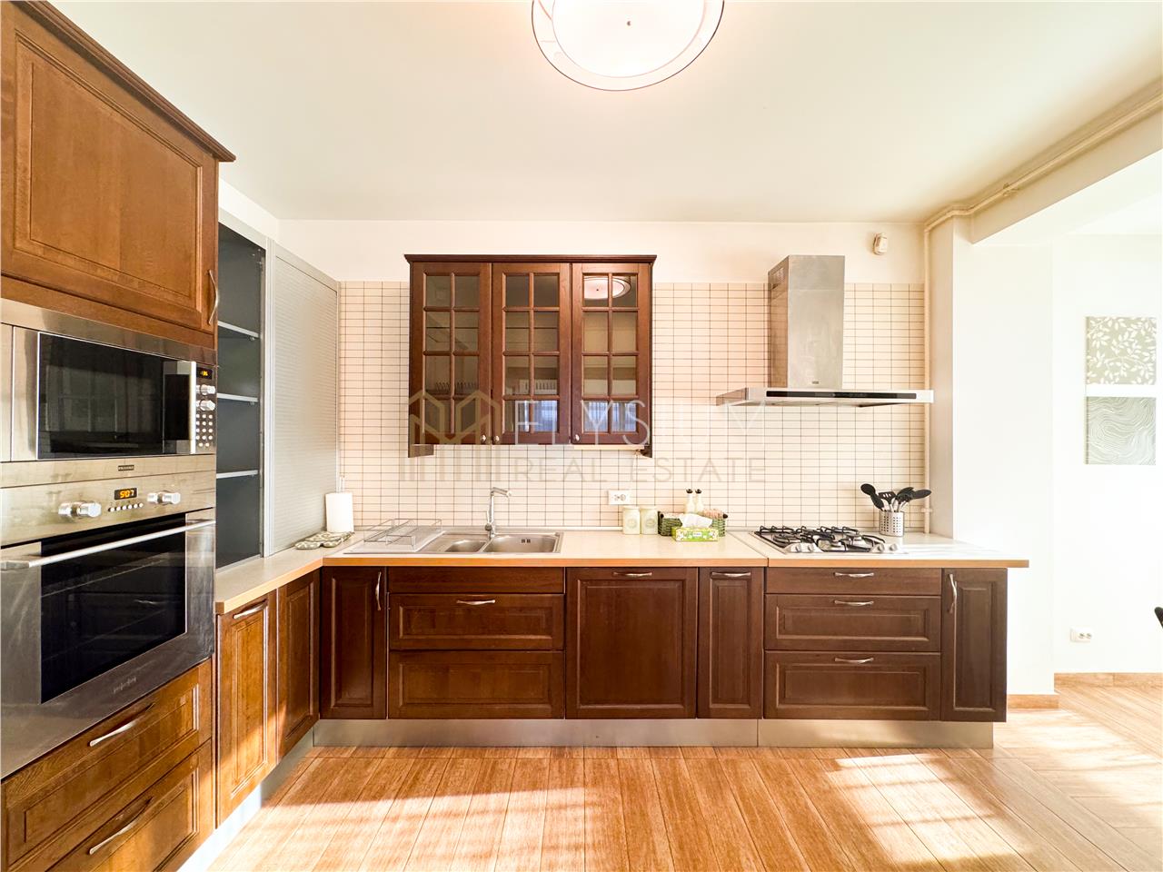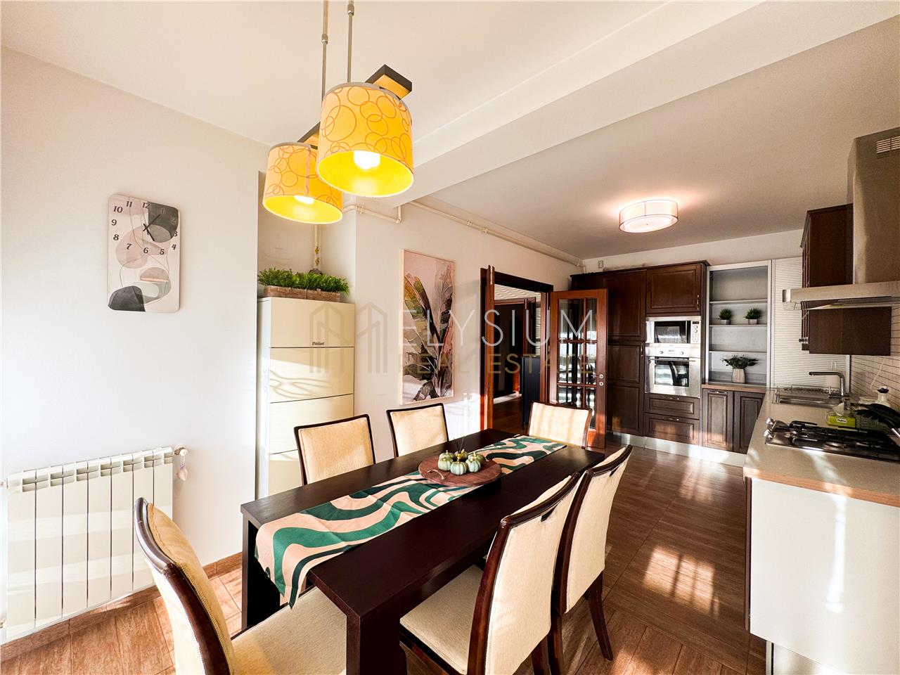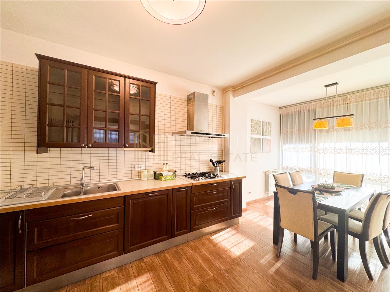 - Bucataria apartamentului este inchisa, cu acces din living. Aceasta este complet mobilata si utilata cu electrocasnice de ultima generatie incorporate in mobilierul de lemn masiv si cuprinde si o zona de dining ce cuprinde o masa accesorizata cu scaune asortate, potrivita pentru 6 persoane.