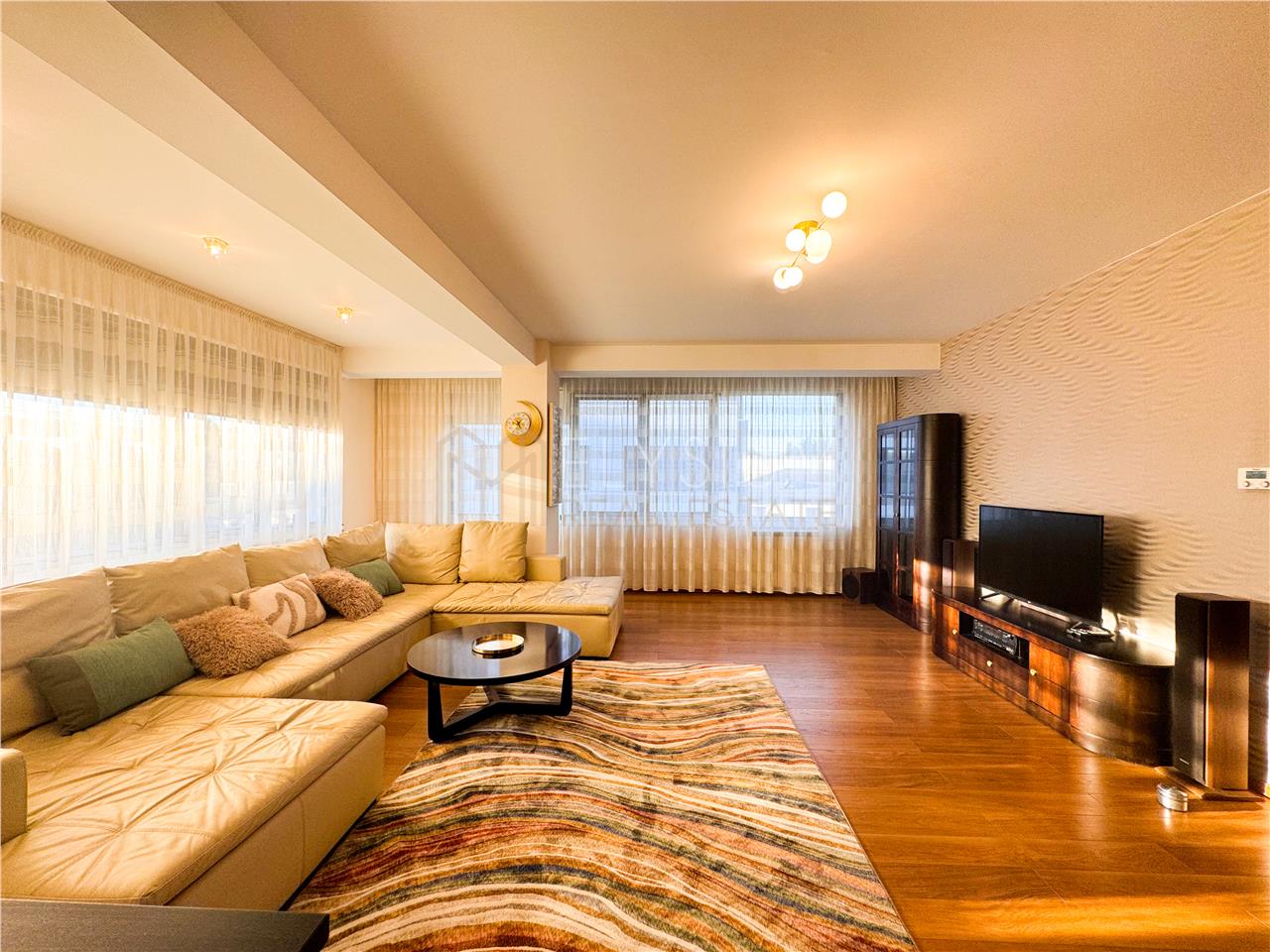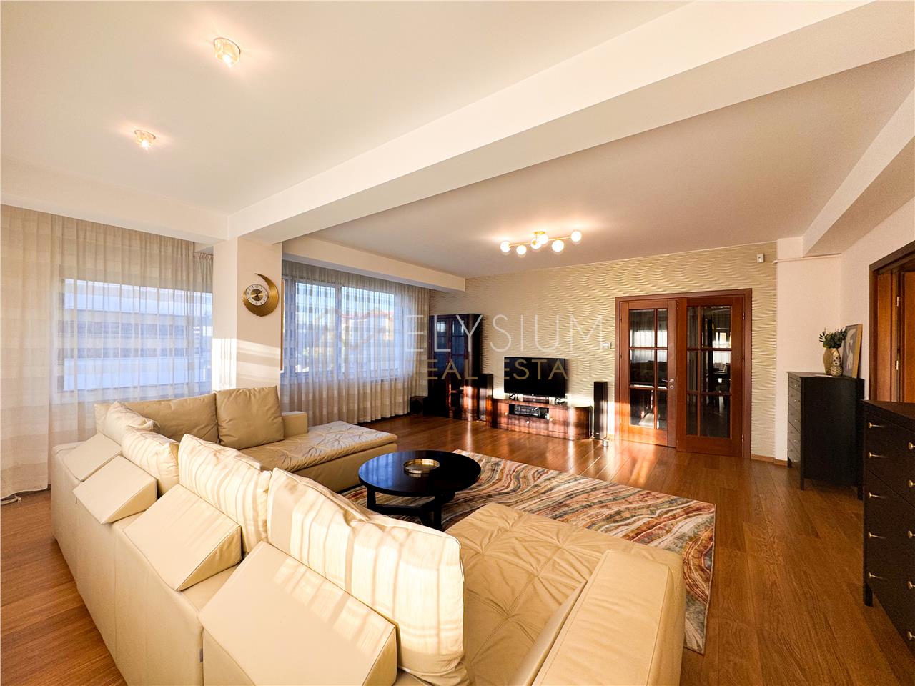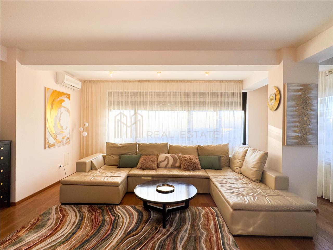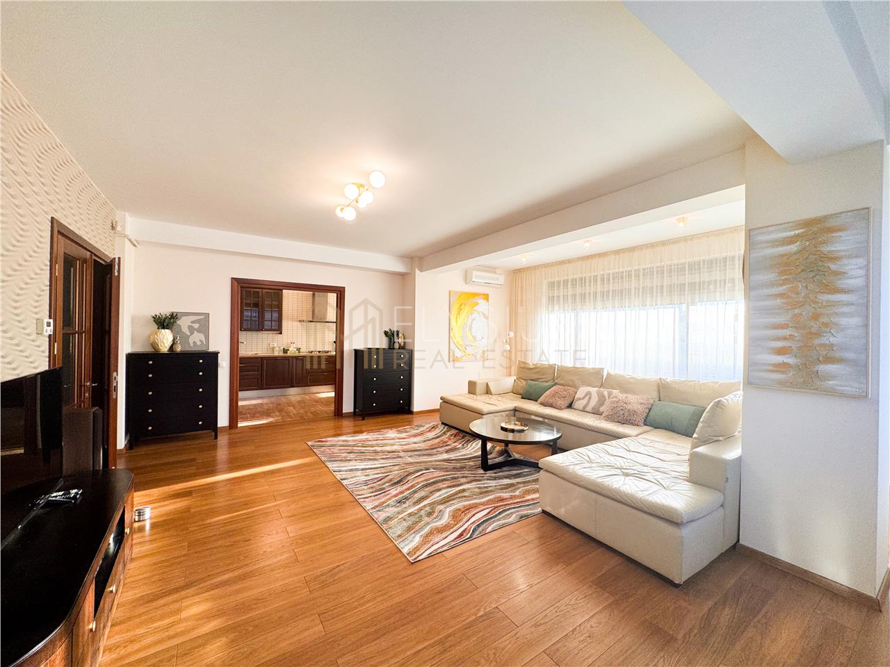 - Livingul apartamentului este reprezentat de un spatiu amplu si deschis, amenajat cu o canapea confortabila de dimensiuni mari, masuta de cafea, comoda ce acomodeaza televizorul tip Smart TV si multiple corpuri de mobilier ce deservesc ca spatii de depozitare si sunt confectionate din lemn masiv.