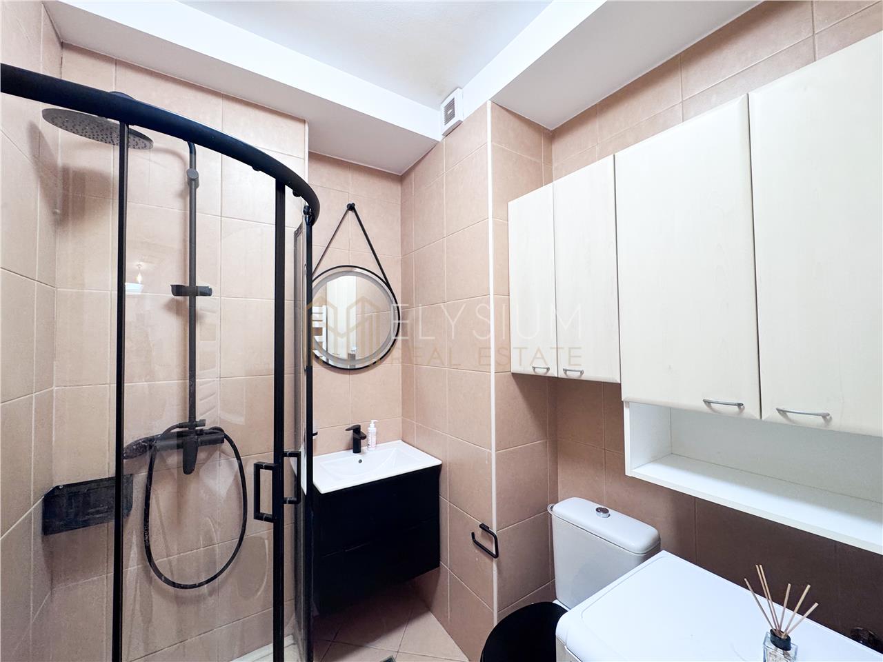 - Cea de-a doua baie a apartamentului deserveste atat zona de noapte cat si zona de zi si este dotata cu cabina de dus, lavoar si vas de toaleta.