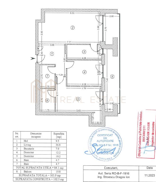 Apartamentul cu 3 camere propus dispune de o suprafata construita de 103.9mp ce include living si bucatarie, 2 dormitoare, 2 bai si o terasa cu o suprafata de 19.8mp. Acesta beneficiaza de o dispunere tip decomandat si finisaje premium precum parchetul, gresia si faianta. In plus, acesta dispune si de un aer conditionat deja montat.