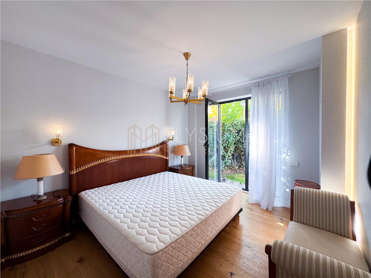 - Dormitorul matrimonial al apartamentului este amenajat cu un pat de dimensiuni mari, noptiere si otoman, toate confectionate din lemn masiv.