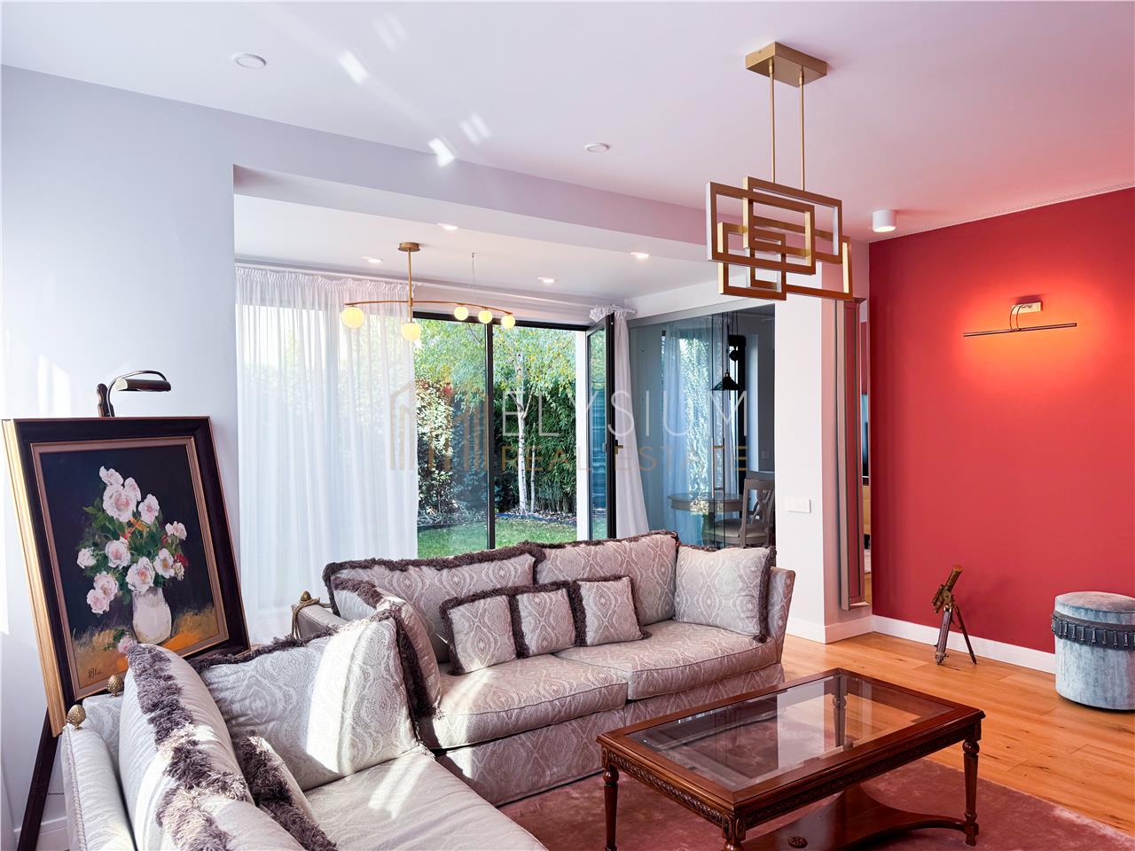 - Livingul este o zona eleganta si relaxanta, amenajata cu 2 canapele confortabile de dimensiuni mari, o masuta de cafea din lemn masiv si sticla, comoda ce acomodeaza televizorul tip Smart TV si este accesorizat cu elemente de decor ce aduc un plus de rafinament spatiului.