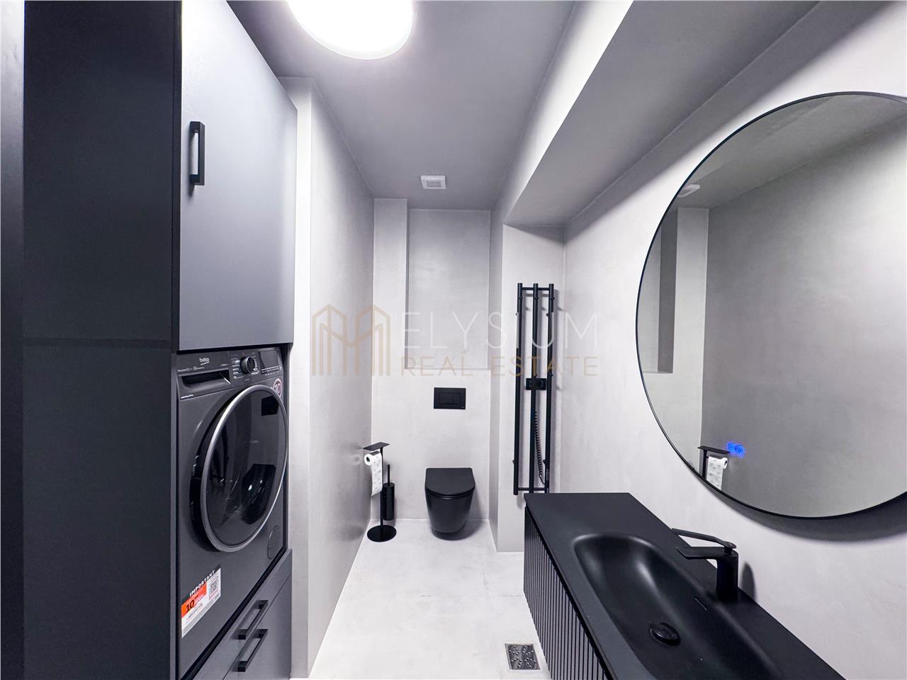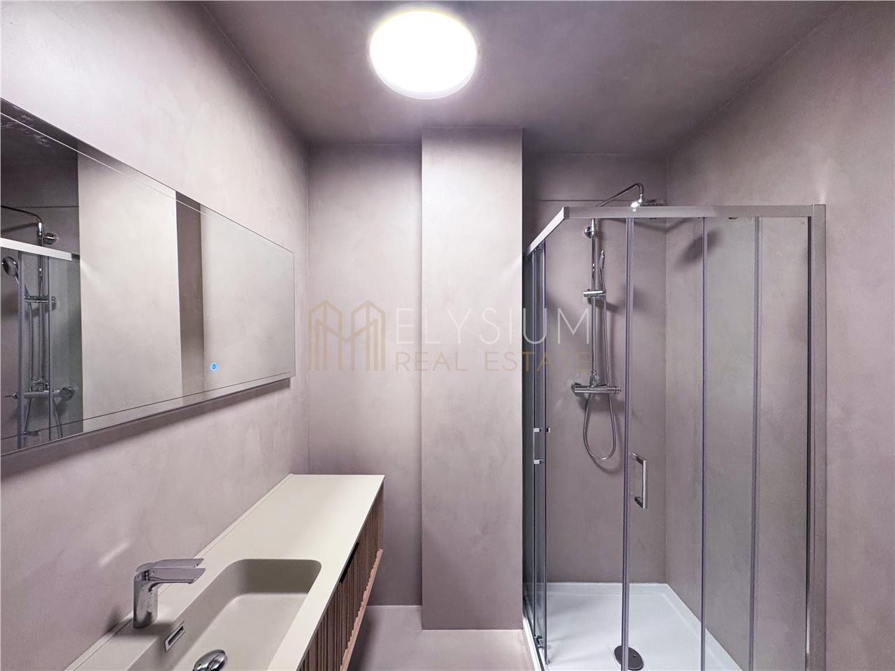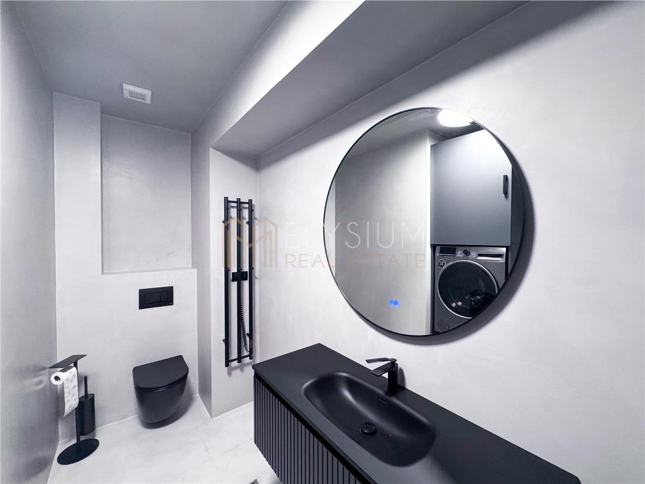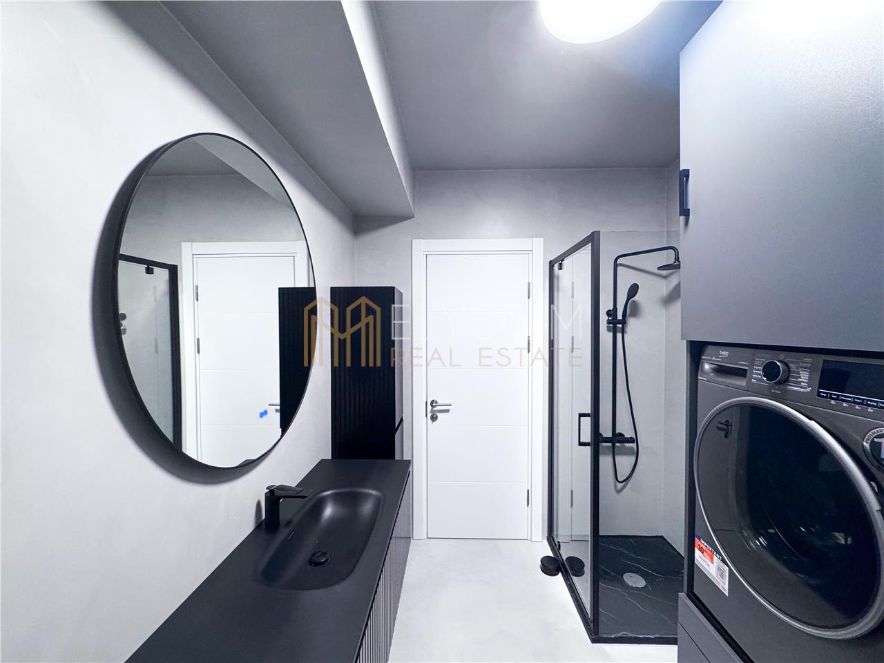 - Zona de noapte dispune de inca o baie individuala, ce poate deservi si zona de zi, si este dotata cu dus, lavoar, vas de toaleta, spatii de depozitare, masina de spalat si uscator de rufe.