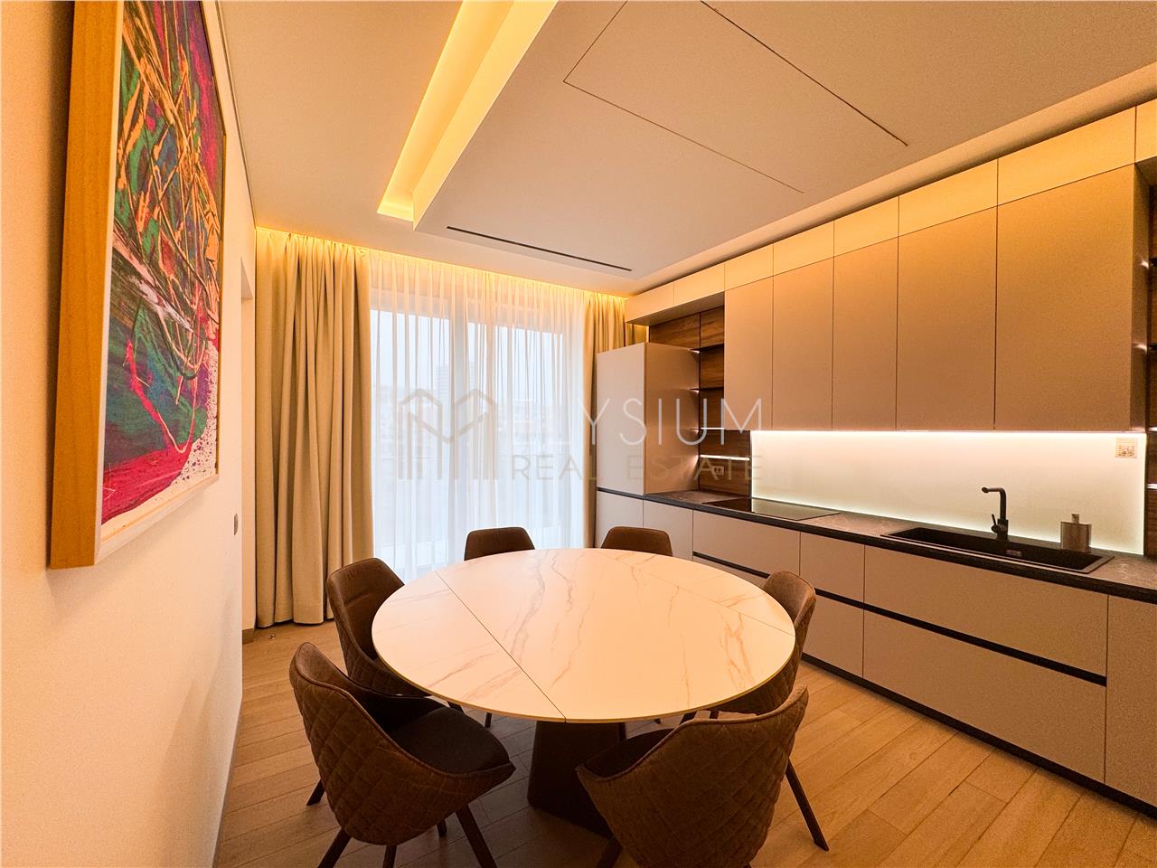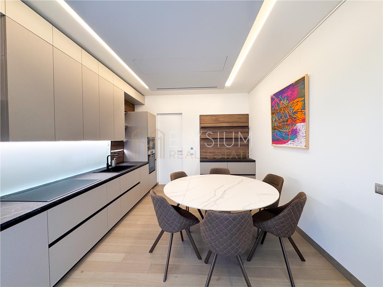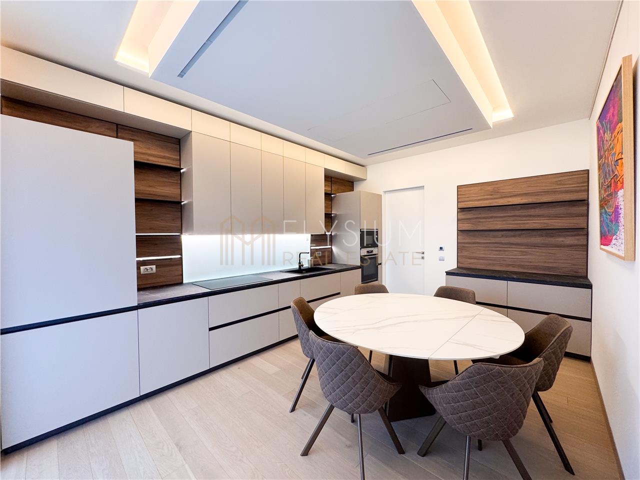 - Bucataria este inchisa, complet mobilata cu multiple spatii de depozitare si utilata cu electrocasnice noi, de ultima generatie si integreaza si un spatiu pentru servit masa, potrivit pentru 6 persoane.