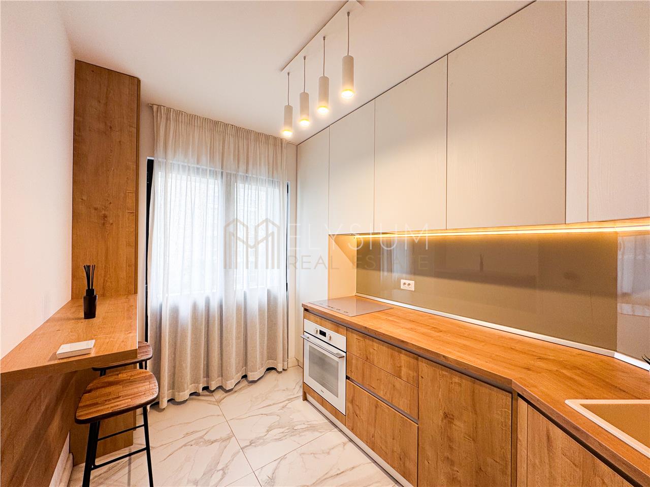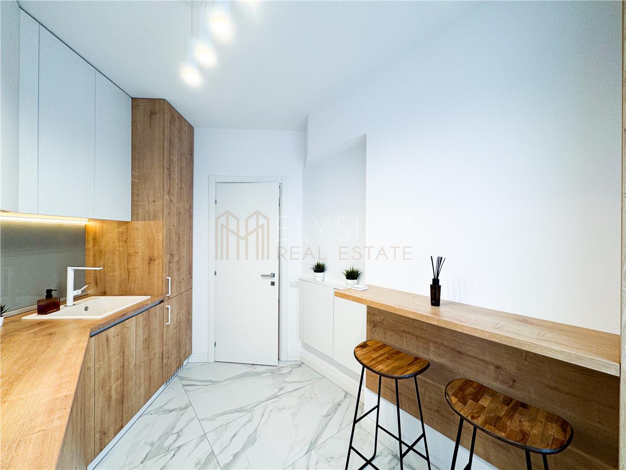 - The kitchen is a closed space, modernly arranged, fully furnished, and equipped with multiple storage areas and brand-new, state-of-the-art appliances. It also includes a small dining area with high bar stools, suitable for two people.