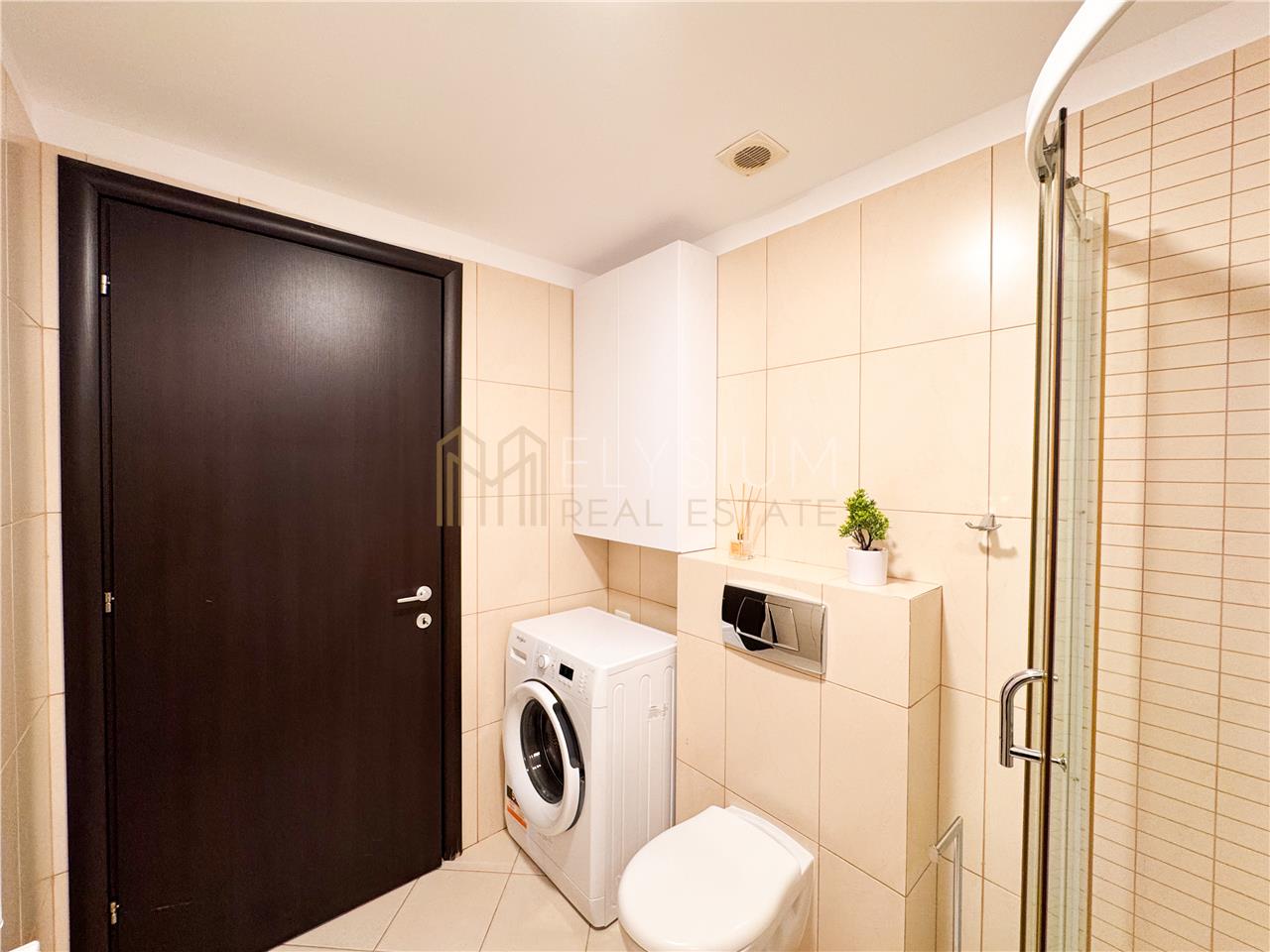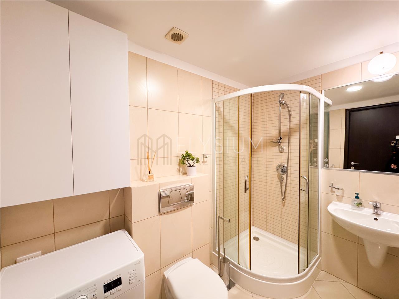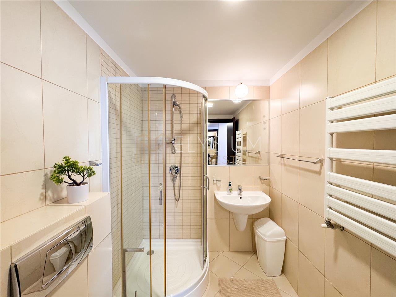 - The apartment's second bathroom is equipped with a modern shower cabin, sink, toilet, and cleverly integrated storage space. Its contemporary design and high-quality finishes ensure a practical and aesthetically pleasing environment.